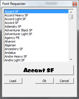 The font requester offers a preview of the highlighted font, and the ability to load in a .ttf font file which has not been installed on the computer.