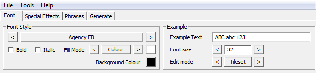 The font tab is the start point of the BMFC, it is split into two areas; The Font Style panel and the Example Panel.