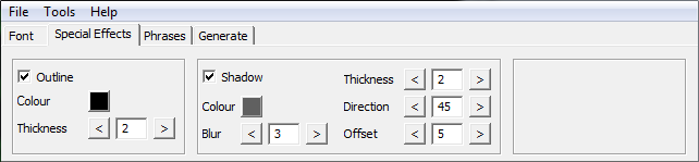 The second panel is the Shadow panel. Again the tick box selects whether the shadow is drawn or not. The colour and thickness controls are exactly the same as the Outline panel as well. However you also have a few extra controls allowing you to change the angle, level of blurring and offset (Distance from text)
