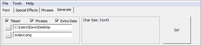 The Generate tab is the last of the four tabs on your Bitmap fonts creation. From here you can choose the output path and filename, as well as which elements (Tileset, Phrases and Extra Data) are outputted. The tile set is a 10 x 10 grid of characters. Phrases are saved as individual files and are named the same as the output file name but with "PhraseN" appended. (Where N is a number), and the Extra Data is a .txt file detailing the positions and sizes of the letters in the tileset to make it easier to use them inside programs.